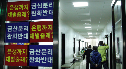 | ▲ 21일 야당이 사흘째 점거중인 국회 정무위 회의실앞에 '금산분리완화반대' 등 구호가 적힌 플래카드가 나붙어 있는 등 전운이 감돌고 있다. ⓒ연합뉴스 |