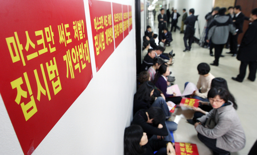 | ▲ 19일 민주당 당직자 등이 국회 행정안전위원회 회의장 앞에서 한나라당 의원 등의 회의장 진입을 막고 있다.민주당은 한나라당이 집시법 위반 벌금 형량을 10배 이상 늘리고, 마스크 착용까지 금지하는 것을 주요 내용으로하는 집시법 개정안 단독 상정을 할 가능성이 있다며 회의장 입구를 막고 있다. ⓒ연합뉴스 |