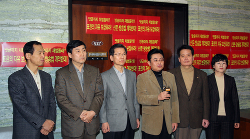 | ▲ 21일 국회 문방위 회의실앞에서 민주당 소속 의원들이 언론장악 7대악법 저지를 위해 상임위를 점거한다고 밝히고 있다. 왼쪽부터 최문순, 이종걸, 천정배, 전병헌, 장세환, 김상희 의원. ⓒ연합뉴스 |