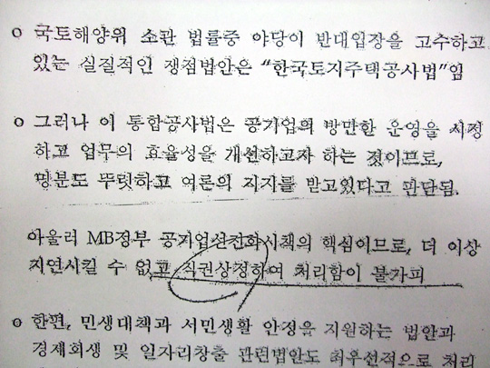문건에는 특히 "아울러 MB정부 공기업선진화 시책의 핵심이므로, 더이상 지연시킬 수 없고 직권상정하여 처리함이 불가피"라고 적혀 있다.