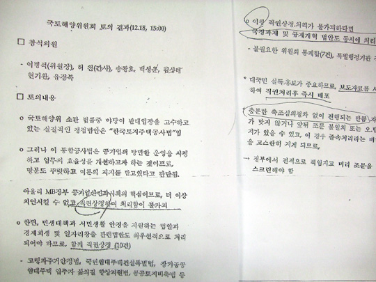 | ▲ 민주당이 한나라당이 작성했다고 주장하며 공개한 국토위 문건의 일부. ⓒ프레시안 |