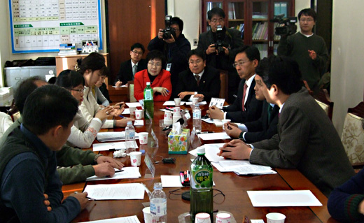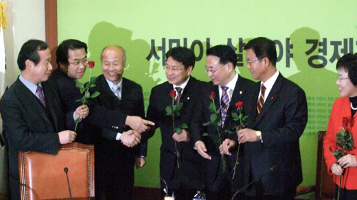 "MB악법 저지"를 선언하고 국회 각 상임위 회의장을 점거 농성 중인 민주당에 지지와 격려의 발길이 계속되고 있다. 23일에는 진보적 시민사회단체들로 구성된 '민생민주국민회의(준)'가 장미꽃 한 다발을 들고 민주당과 민주노동당 지도부를 찾아 격려했다.