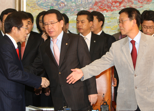 | ▲ 5일 오후 국회의장실에서 김형오 국회의장 주최로 열린 국회의장-여야3당 원내대표 회담에서 원혜영 민주당 원내대표가 홍준표 원내대표에게 먼저 손을 내밀어 악수를 청하고 있다. ⓒ연합뉴스 |