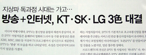 여기에 한 가지를 덧붙이면 지상파 방송 진입장벽을 감안할 때 대기업 등이 IPTV에 채널을 차리고 컨텐츠 공급업자로 진입하기 위한 장벽도 낮은 편이다. 결국 대기업의 방송진출 허용은 이와 같은 밑그림이라는 분석이 가능하다.