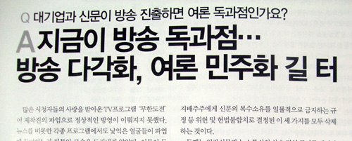 "독과점 구조로 기존 지상파방송만 배불렸다", "Q : 대기업과 신문이 방송 진출하면 여론 독과점인가요? A : 지금이 방송 독과점 방송 다각화, 여론 민주화 길 터", "지상파 독과점 시대는 가고…방송+인터넷, KT·SK·LG 3色 대결" 등이다. 참고로 "지상파 독과점 시대는 가고…" 기사는 통신 3사 및 정부의 IPTV 투자전략을 소개하고 있을 뿐 '지상파 독과점'에 대한 내용은 전혀 없음에도 불구하고 제목을 이와 같이 뽑는 등 '지상파 독과점'을 집중 공격하고 있다.