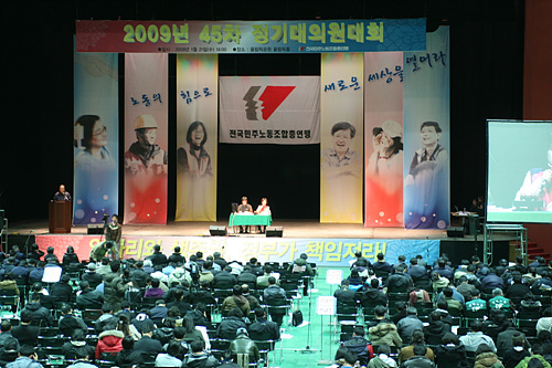 그러나 정작 구체적인 사안을 놓고는 '엄혹한 정세' 이전과 다를 바 없이 팽팽한 의견차를 보였다. 생각의 차이는 사소한 데서 비롯됐다. 21일 오후 서울 송파구 올림픽공원 올림픽홀에서 열린 민주노총의 제45차 정기대의원대회는 과거와 똑같았다.