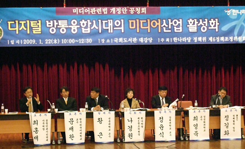 정 PD는 이어 "한나라당이 여론 수렴 없이 밀어붙이기를 하고 있다는 지적이 없지 않았다"며 "(여론수렴 안 한다는) 콤플렉스 때문에 공청회라는 이름을 단 것은 아닌지 모르겠다"고 말했다.