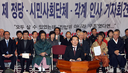 | ▲ 29일 서울 종로구 기독교회관에서 열린 용산폭력살인진압 규탄 및 MB악법저지를 위한 제정당 시민사회단체-각계 인사 공동기자회견에서 민주당 정세균 대표가 진상규명과 관련자 처벌 등을 요구하고 있다. ⓒ연합뉴스 |