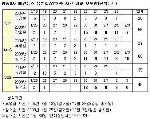 통계적으로도 이번 사건이 유영철 사건에 비해 더 많이 보도됐다는 민언련의 모티너링 조사 결과를 바탕으로 "연쇄살인범 보도가 급증하자 용산참극에 대한 보도는 급격하게 줄어들었다"면서 "'살인범을 띄워 언론보도의 프레임을 바꾸라'는 여론조작 지침이 결국 그대로 작동한 것"이라고 주장했다.