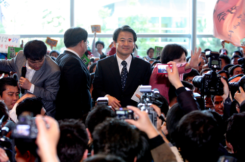 | ▲ 재보선 출마를 위해 귀국한 정동영 전 통일부 장관이 22일 인천공항에서 수많은 지지자들의 환호에 감격하고 있다. ⓒ연합뉴스 |