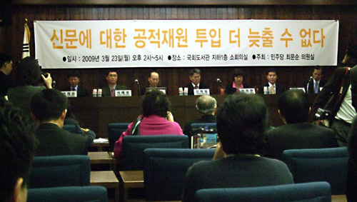 | ▲ 23일 오후 국회도서관 소회의실에서 민주당 최문순 의원 주최로 열린 '신문에 대한 공적재원 투입 더 늦출 수 없다' 토론회. ⓒ프레시안 |