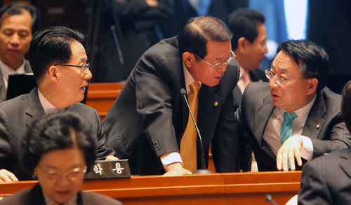 | ▲ 30일 오전 국회 예결위 회의실에서 열린 민주당 긴급의원총회에서 정동영 전의원측 최규식 의원(오른쪽)이 박지원, 최인기 의원과 얘기하고 있다. ⓒ연합뉴스 |