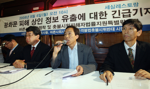 | ▲ 지난해 8월 촛불시위 관련 "네티즌들의 피해 상인에 대한 협박 및 욕설 전화가 끊이지 않고 있다"며 "아직 소송을 제기하지 않은 상인들의 요구에 따라 3차 소송을 추진하고 있다"고 밝히고 있는 이재교 교수. ('바른시위문화정착 및 촛불시위피해자법률지원특별위원회') ⓒ연합뉴스 |
