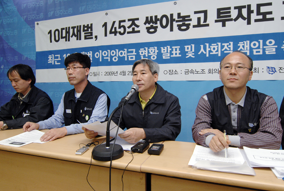 전국금속노동조합(위원장 정갑득)은 이날 기자회견을 열고 2000년부터 20008년까지 9년 동안의 감사보고서를 토대로 이런 분석 결과를 발표했다. 이들은 "외환위기 이후 10년간 그들의 성장을 위해 많은 희생을 감내한 비정규직, 중소기업, 지역 주민에게 진정한 보답을 하려면 이익잉여금의 10%, 14조 원을 내놓아야 한다"고 주장했다.