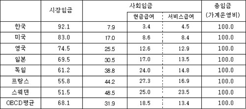 사회임금은 아동수당(보육료 지원), 공적연금(국민연금, 기초노령연금) 등 돈으로 직접 지급되는 현금급여와 의료서비스, 공공임대주택 등 현물방식으로 지원되는 서비스급여로 나눌 수 있다. 한국은 현금급여 수준이 특히 낮아 가계운영비의 3.4%밖에 안 됐다. 미국(8.6%)과 영국(12.6%)은 상대적으로 현금급여가 차지하는 비중이 낮았고, 프랑스(27.3%), 스웨덴(25.0%), 독일(24.0%)이 높았다.