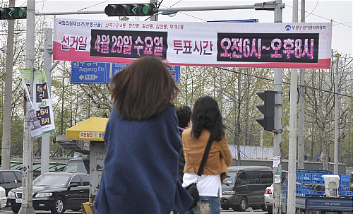 | ▲ 시민들의 무관심 속에 인천시 부평구 갈산역 사거리에서 선거관리위원회의 4.29 재보선 투표 독려 플래카드가 걸려 있다. ⓒ뉴시스 |