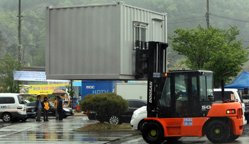 | ▲ 박연차 게이트에 대한 검찰의 노무현 전 대통령 소환이 예상보다 늦어지고 있는 가운데 20일 오후 경남 김해시 봉하마을에서 취재중인 한 언론사에서 사용할 컨테이너하우스가 설치되고 있다. ⓒ연합뉴스 |