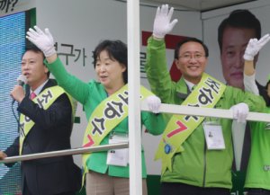 | ▲ 4.29 울산 북구 재선거에 출마한 조승수 진보신당 후보(왼쪽)와 노회찬 대표(오른쪽), 심상정 전 대표(가운데)가 28일 울산 북구 평창리비에르아파트 앞에서 유권자들에게 지지를 호소하고 있다. ⓒ연합뉴스 |