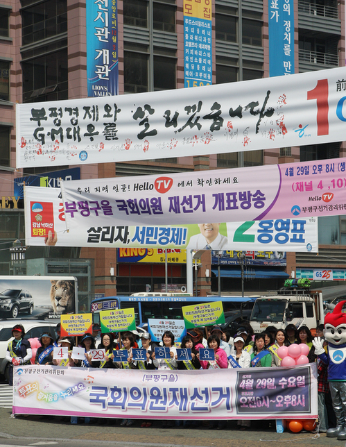 | ▲ 부평을 4.29 국회의원 재선거가 하루 앞으로 다가온 28일 부평구선거관리위원회 투표홍보단이 부평구 갈산역 사거리에서 시민들에게 투표 참여를 독려하는 홍보 활동을 펼치고 있다. ⓒ연합뉴스 |