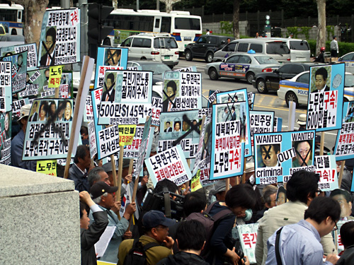 노 전 대통령의 얼굴과 김정일 국방위원장의 사진을 나란히 건 뒤 검정색 페인트로 X자를 그은 피켓에는 "대북 퍼주기 북핵미사일자금 노무현 구속!", "검찰은 권력형부패 노무현 즉각 구속하라!", "국민기만 노통 철저히 수사!", "5공 청문회 스타, 알고보니 똑같네", "노무현 측근 일가친척 철저 수사, 빙산의 일각" 등의 비난 문구들이 적혀 있었고, 이들은 "600만 불 노무현 구속" 등의 구호를 외치며 피켓을 흔들었다.