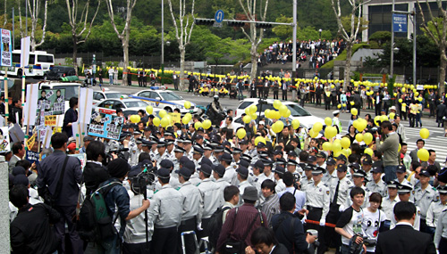 한편 노 전 대통령이 도착하기 1시간여 전부터 노사모 등 노 전 대통령 지지자들이 대검 청사 주변으로 몰려와 거리 주변에 노란 풍선을 매다는 등 노 전 대통령을 응원하기 위한 활동을 펼쳤다.