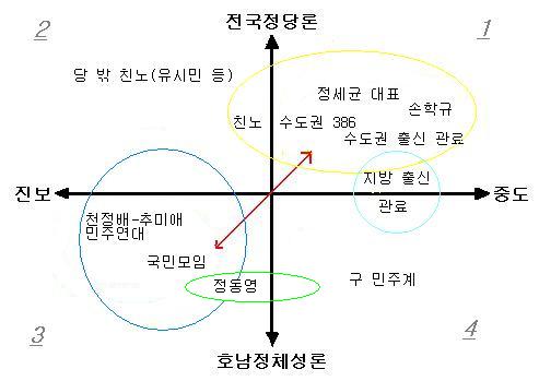 정 의원이 최근 들고 나선 슬로건도 '진정한 진보'이다. 진정성에 대한 의구심이 없지 않지만 정동영 의원은 '강한 야성'과 '진보색채 강화'를 들고 국회로 돌아올 것으로 알려졌다. '표1'의 3사분면을 치고 들어가 정세균 대표 나아가 손학규 전 대표와 차별성을 확고히 하겠다는 전략으로 풀이된다.