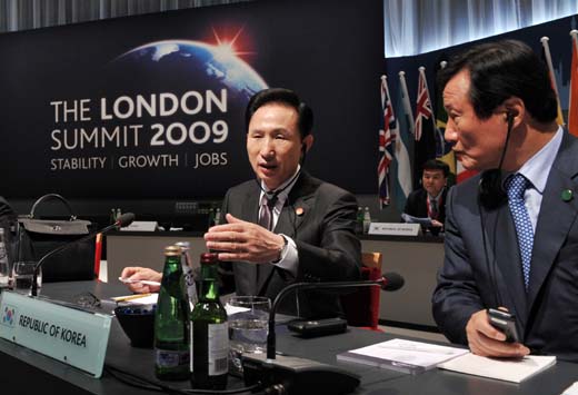 | ▲ 지난 4월 영국 런던에서 열린 G20 정상회의에 참석한 이명박 대통령과 윤증현 기획재정부 장관(오른쪽) ⓒ연합 |