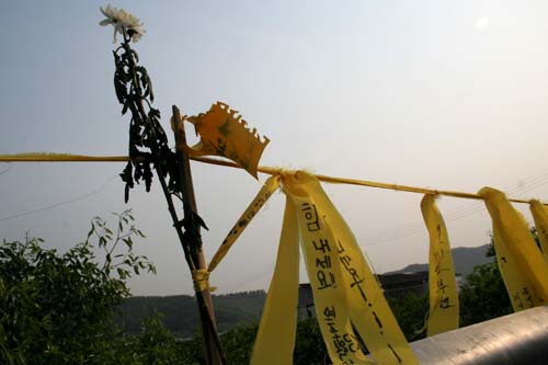 분향소 입구부터 노무현 전 대통령의 생가까지는 '노사모'의 상징인 노란색 리본이 걸려 있었다. 김해 봉하마을에 차려진 공식 분향소 맞은편 건물에는 검은색 천에 하얀 글씨로 '우리는 당신을 영원히 기억할 것입니다'라는 대형 현수막이 펼쳐져 있었다. 이 건물은 당초 노무현 기념관으로 만들 예정이었지만 현재는 불투명한 상황이다.