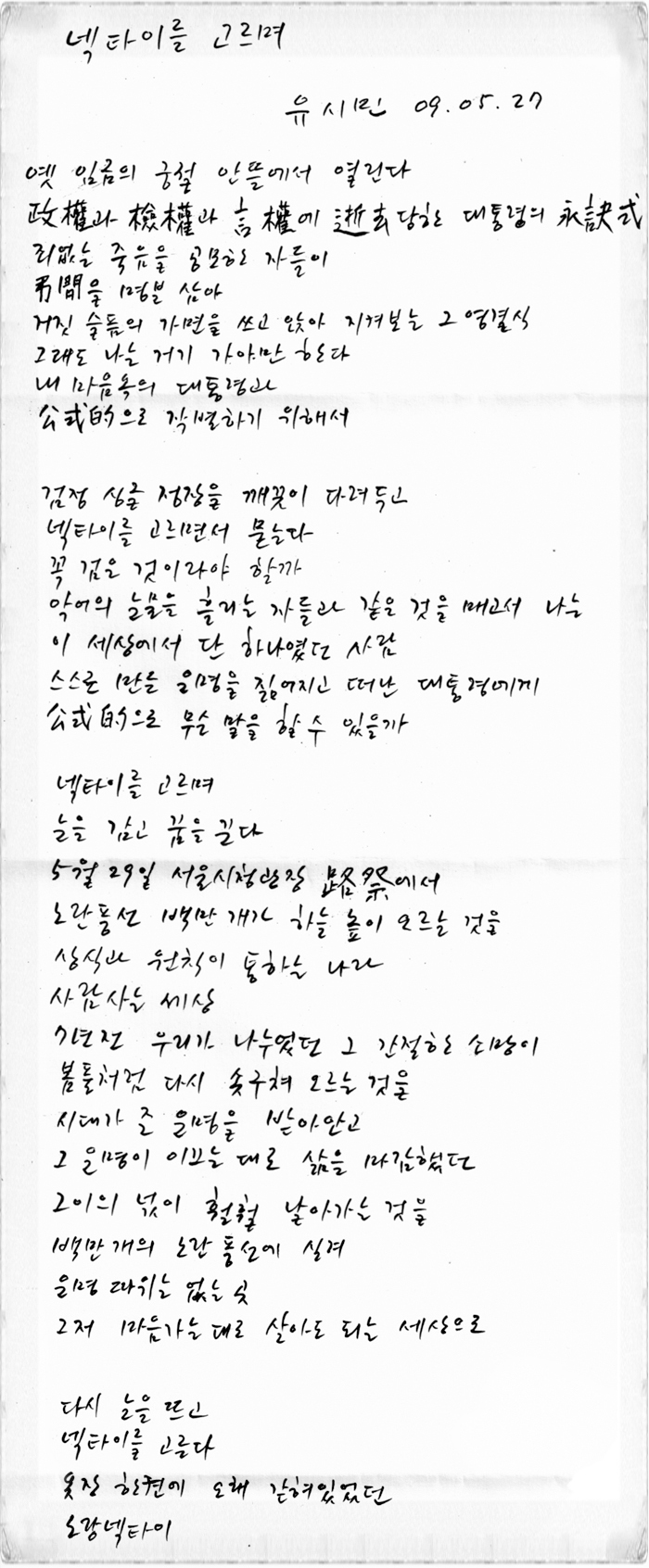 유 전 장관은 이어 "검정 싱글 정장을 깨끗이 다려두고 넥타이를 고르면서 묻는다"며 "꼭 검은 것이라야 할까. 악어의 눈물을 흘리는 자들과 같은 것을 매고서 나는 이 세상에서 단 하나였던 사람. 스스로 만든 운명을 짊어지고 떠난 대통령에게 공식적(公式的)으로 무슨 말을 할 수 있을까"라고 되뇌였다.