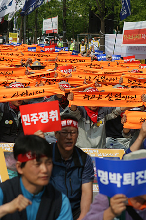 민주노총이 이명박 대통령 '퇴진' 구호를 내걸고 본격적인 집중 투쟁의 시동을 걸었다. 임성규 민주노총 위원장은 "지금 확실히 (이명박 대통령을) 끌어내리지 못하면 남은 임기 동안 우리 노동자는 처절한 복수를 당할 것"이라며 총력 투쟁의 필요성을 호소했다.