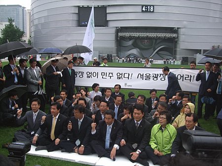 이에 대해 민주당 김유정 대변인은 16일 오전 논평을 통해 "시민의 세금으로 만든 서울광장을 시민들이 사용하지 못하도록 불법으로 막더니 이제는 야당에 변상금까지 물리겠다고 하니 어처구니가 없다"고 비난했다.