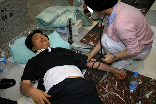| ▲ 몸싸움 과정에서 실신해 의료진의 치료를 받고 있는 민주당 관계자 ⓒ프레시안 |