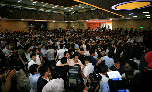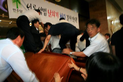 한편 국회의사당 정문에는 언론노조가 국회진입을 시도하며 경찰들과 몸싸움을 벌이는 등 본회의장 주변뿐만 아니라 국회 곳곳에서 미디어법을 둘러싼 격렬한 충돌이 진행되고 있다.