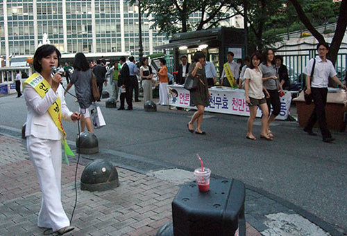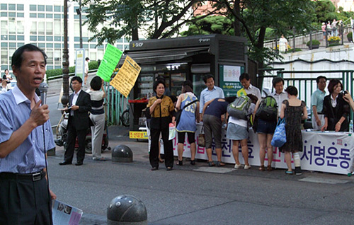 명동성당 앞에 서명대를 차린 지 어느새 6일째. 지나는 사람들의 관심이 식을 법도 했지만 여전히 많은 사람들이 서명을 했고, '삐끼' 역할을 하는 최 의원과 김 전 의원이 잡아끌지 않아도 알아서 서명대로 성큼성큼 걸어가 서명하는 시민들도 제법 많았다. 한 젊은이는 오토바이를 타고 지나쳤다가 오토바이를 세우고 헬멧을 쓴 채로 터벅터벅 되돌아와 서명을 하기도 했다.