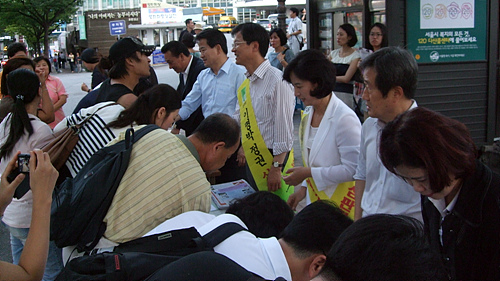 5일 오후 6시 서울 명동성당 들머리. 의원직 사퇴서를 내고 거리로 나선 민주당 최문순 의원이 지나가는 차에 전선이 밟혀 소리가 켜졌다 꺼졌다 말썽인 마이크를 쥐고서 거리를 향해 외치고 있었다. 옆에서는 김희선 전 의원이 "이봐 젊은이 잠깐만 시간 좀 내줘"라며 행인들의 손목을 잡아 이끌었다.