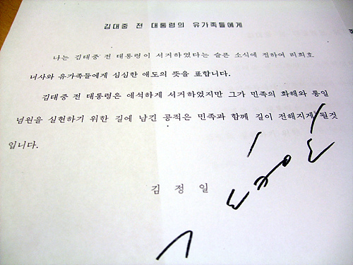 | ▲ 김정일 위원장이 서명한 조전 사본. ⓒ프레시안 |