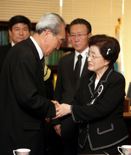 | ▲ 김기남 비서를 맞이하고 있는 이희호 여사. ⓒ장례위원회 |