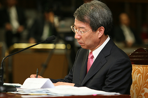| ▲ 질문을 메모하고 있는 정운찬 국무총리 후보자. ⓒ프레시안 |