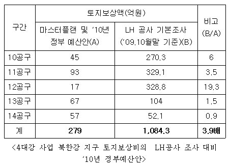 "정부 예산 토지보상비와 조사액 4배 차이"