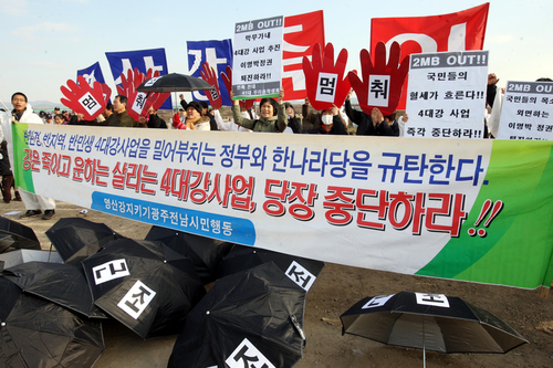 | ▲ 광주.전남 환경단체들이 22일 오후 전남 나주시 노안면 '4대강 살리기 희망선포식(기공식)'이 열리고 있는 학산교 인근에서 영산강 사업 중단을 촉구하는 집회를 열고 있다. ⓒ연합뉴스 |