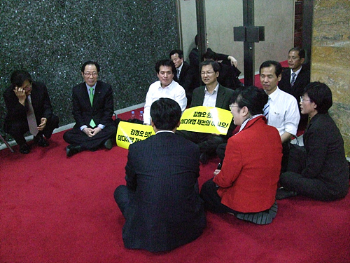 | ▲ 오후 4시경. 딱딱한 분위기의 농성 초반. 김상희 의원이 찾아와 최문순 의원과 대화를 나누고 있다. ⓒ프레시안 |