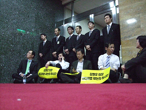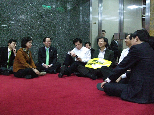민주당 박주선 최고위원도 찾아와 이들을 격려했다. 최근 "이명박 대통령을 탄핵해야 한다"는 등 발언 수위가 점점 강해지고 있는 박 최고위원은 이날 오전 강제퇴거 상황을 언급하며 마치 '내가 혼내줄께'라는 듯 "김형오 의장이 경위권 발동했어?"라고 묻기부터 했다.