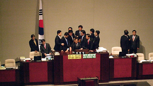| ▲ 민주당이 17일 예결위원장석을 점거한 가운데 한나라당 심재철 예결위원장과 김광림 의원이 철수를 요구하고 있다. ⓒ프레시안 |