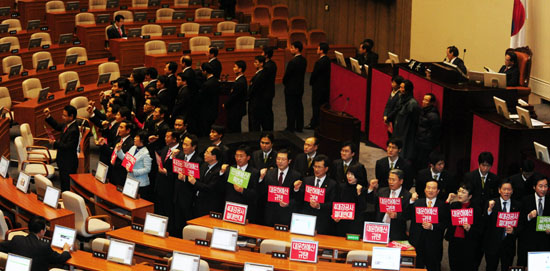 장소 변경된 예결위 회의장 진입 자체가 봉쇄된 민주당은 예결위 처리 상황이 종료된 뒤 예결위 회의장 앞에서 규탄대회를 갖고 "국회가 한나라당 이명박 정권의 사유물로 전락했다"고 비판했다.