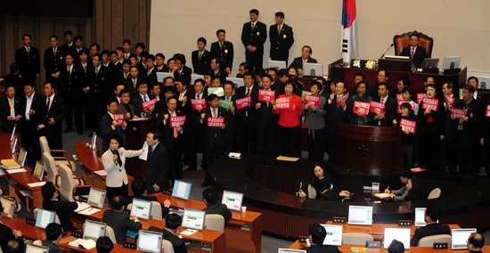 민주당 등 야당 의원들은 속속 본회의장에 입장해 '4대강 공사 절대 반대' 등의 글귀가 적힌 피켓과 "김형오는 사퇴하라" 등의 구호를 외치며 의장석 주변을 에워싸고 개의를 저지했다.